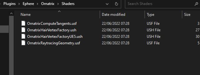 | Please check if the "Shaders" directory is in this location: Program Files\Epic Games\UE_5.0\Engine\Plugins\Ephere\Ornatrix\Shaders and if it contains any files. Jeordanis Figuereo (Product Designer. EPHERE Inc.) |
