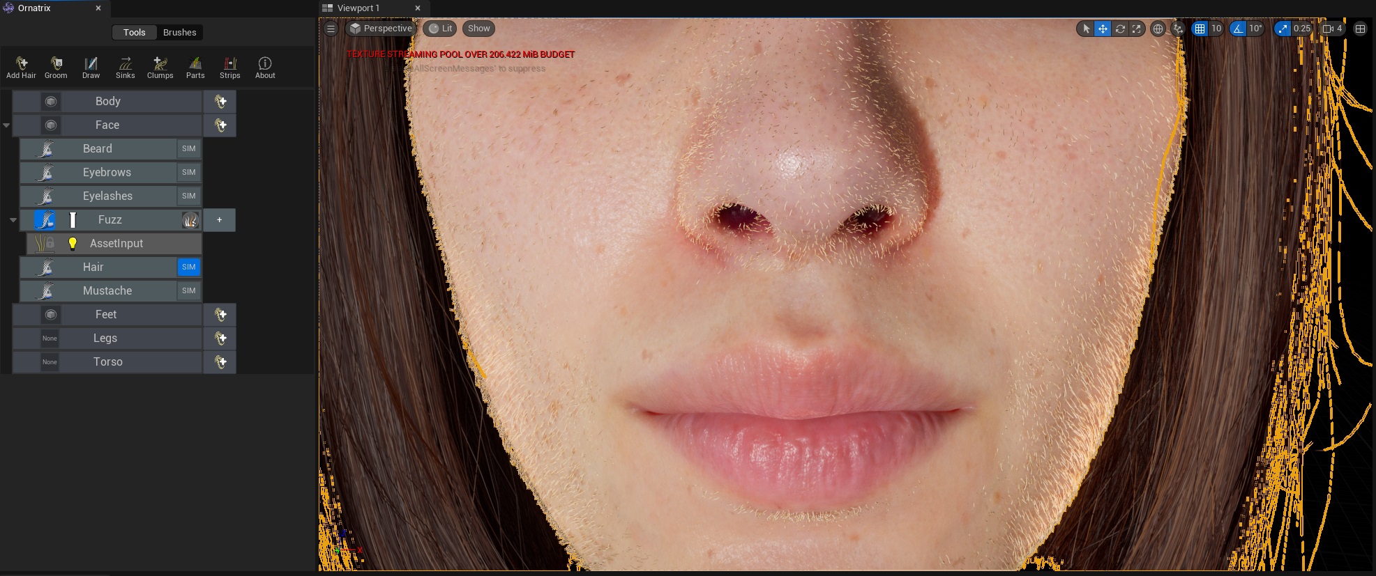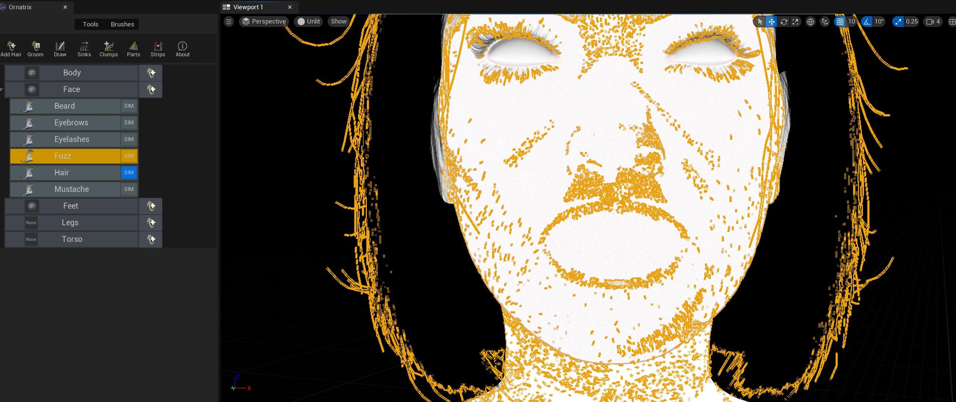 | 1) I start with Meta Human face (Unlit Mode so we can see better), and I have the "Fuzz" (facial Peach Fuzz) part of the groom selected in the Ornatrix groom List: Attached Files: |