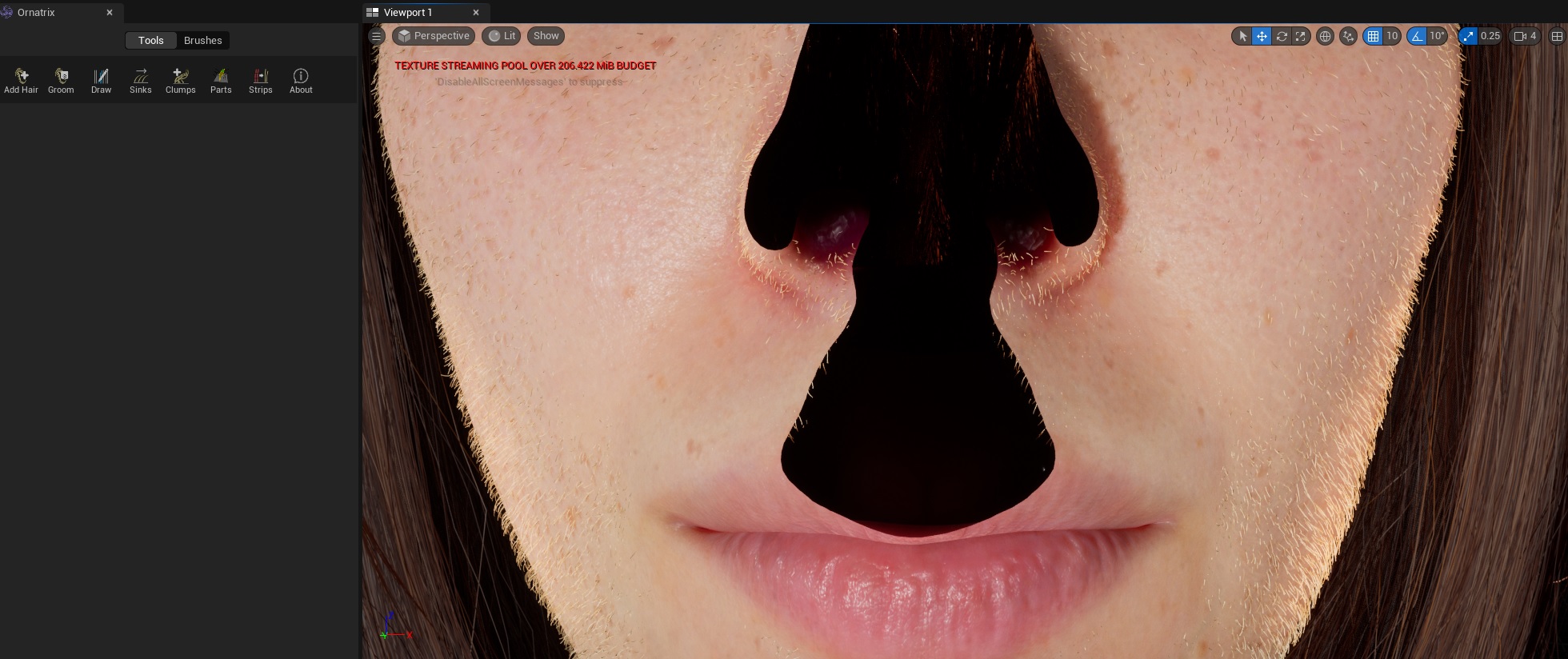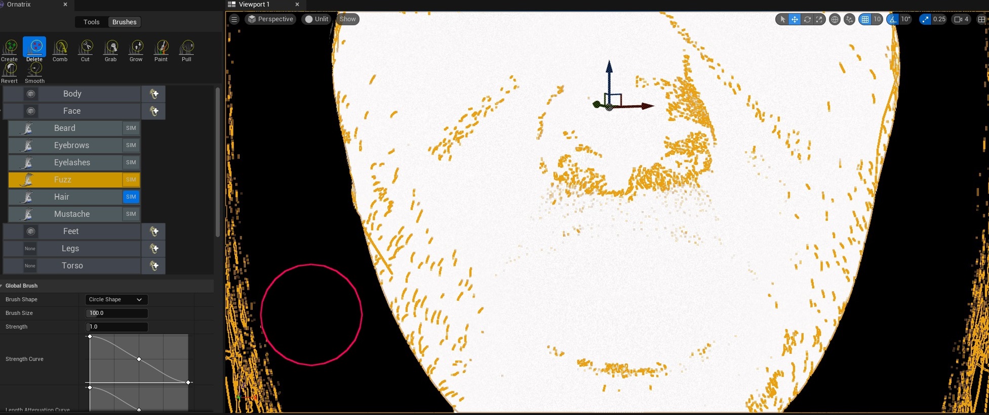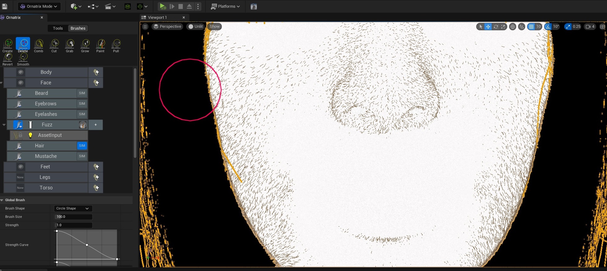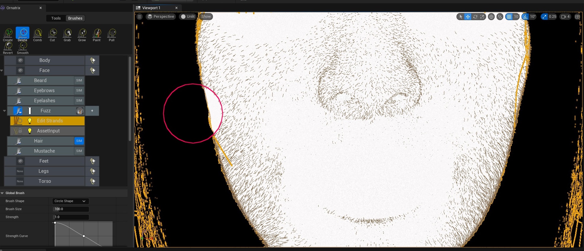 | Hello, thanks for replying. Apologies for confusion, by "PFuzz" I was referring to the Peach Fuzz on a Meta Human's face, labeled as "Fuzz" in the grooms for the Meta Human. At first I was trying to edit the Fuzz groom using the Cut-brush, but it was causing UE5 to crash. I then tried using Delete brush and it works better, no crashes. So, I am now using the Delete brush in this instance. Let me show more specifically the thing I was seeing: |