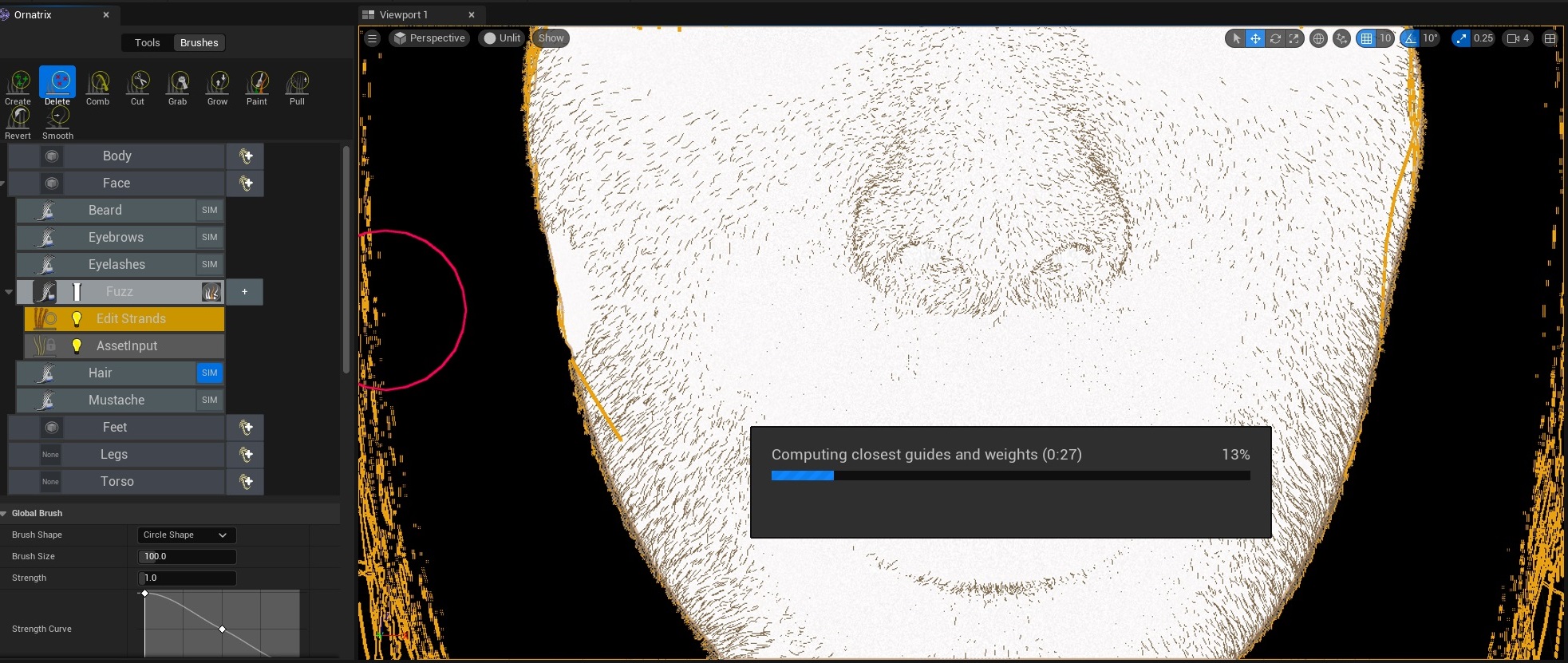 | 3) I toggle on the Fuzz portion to enter Edit mode, via Ornatrix; I activate the Delete Brush to remove part of the Fuzz, on the upper right cheek of the Meta Human Attached Files: |