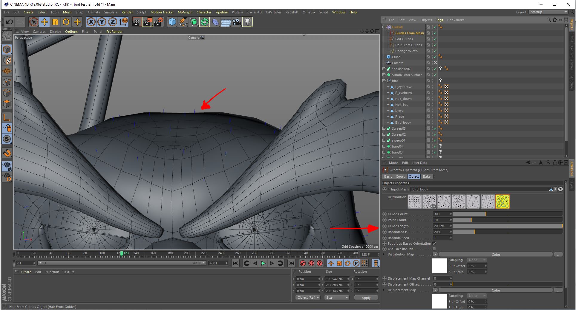 | i understand my scene sclae is abit larger ,the real world scale for my bird is like 20cm, and here its 200cm, so i decreased the scale to .1 now the guide lenght are closer to what i need , however , with the default guide lenght set to 50cm , still we dont get 50cm , here on the pictures ,how this is possible , the bird from top to bottom is 22cm , but the ornatrix says the guide lenght is 50 cm . you can see it on the pictures thanks.   |