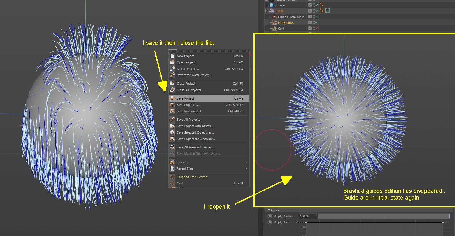 | Description: | Hi , I was noticing that when a save my file ( so with some edited guides brushed ) , and when I reload the file , the guides have jumped back to their initial state ( straighten ) It doesn't seem to record automatically the guide edition (and I don't see any option to 'record' the current guide state before saving and closing the file ) how are we supposed to do ? thx