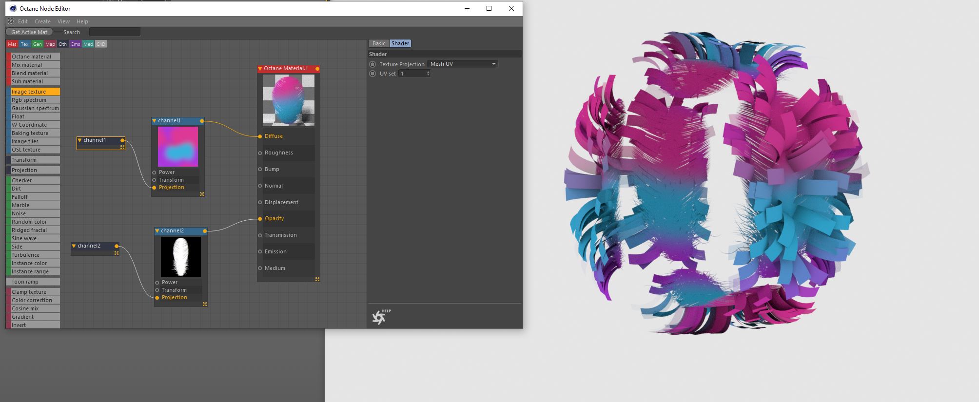 | Ideally this should work without additional plugins or shaders that would need maintenance on every render engine probably. I made it work after some modifications to the plugin made by Roger. Now MeshFromStrands gives specific names to the generated UVW tags: channel1, channel2, channel3, etc, depending on how many channels you created on MeshFromStrands. Now that we now the names, we can call the them in the texture node. As you can see in the following image, one texture is used to drive the opacity and another for the overall color:  In this case I tested with Redshift, which allows to specify a UV channel for each texture node. I created two channels in MeshFromStrands. One with Per-Strands UVs for the opacity texture and another with the distribution mesh UVs for the overall color. In the Redshift texture node for the opacity texture I specified channel1 in the UV section and channel2 for the overall color texture node. This is how it looks:  For this to work you need the latest Ox nightly build available here: https://ephere.com/plugins/maxon/c4d/ornatrix/downloads.html Jeordanis Figuereo (Product Designer. EPHERE Inc.) |