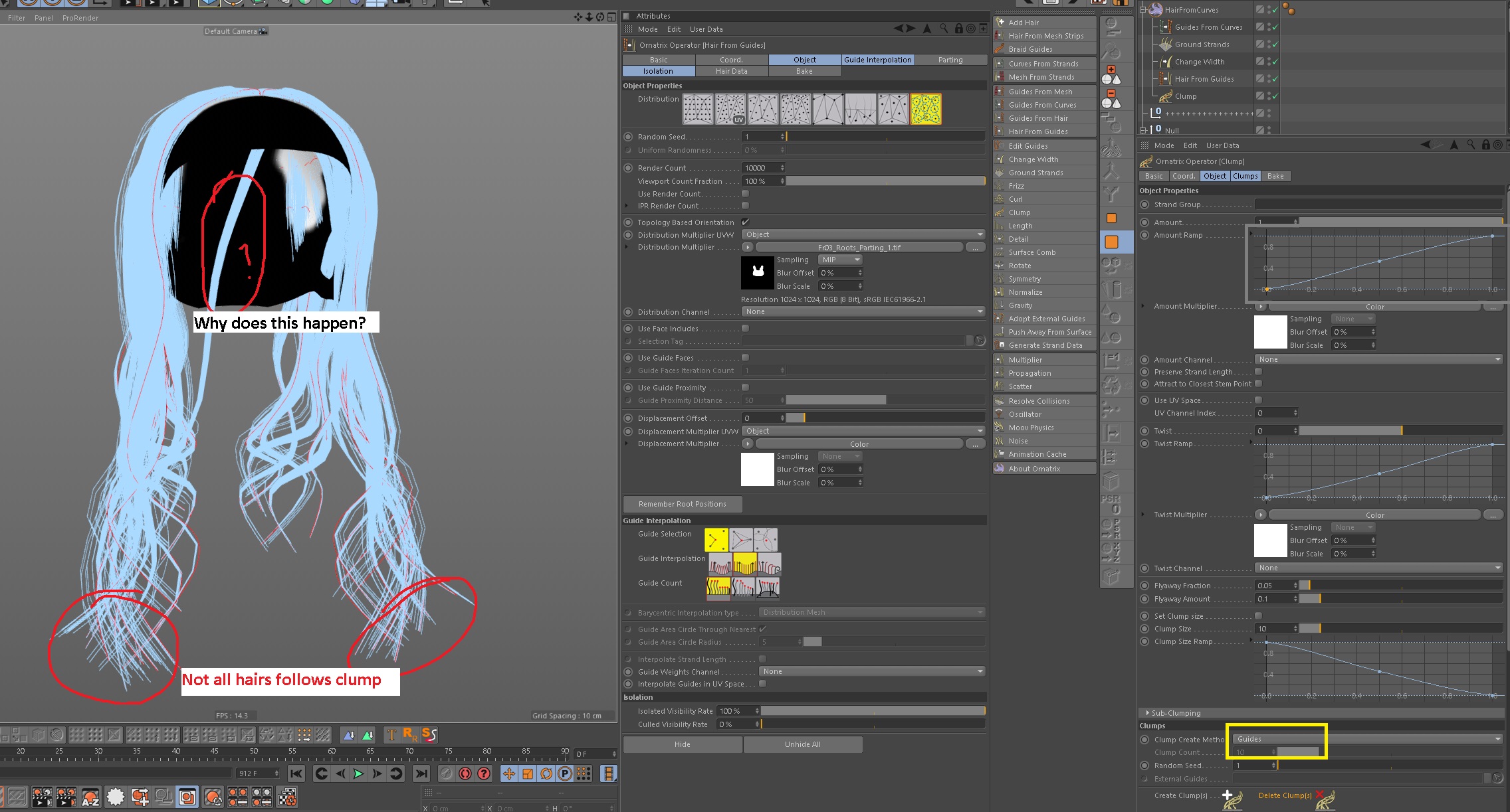 3. In the guides you have a parting on the front, but the interpolation doesn't know about this parting because you are not telling it about it. Correct parting settings will tell Ornatrix how the hairs should be interpolated to each side of the parting. To create parting you can use the parting tool found in Hair from Guides. You can also paint a texture map to represent the parting, where each side of the part is a different color. I would go for the parting plane tool in Hair from Guides.