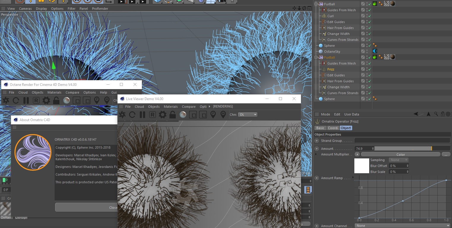 | We use the standard C4D material to render curves. At this moment, the only parameter we change on the material is the Width, all the others will be applied over the Ornatrix Hair. So Ornatrix Frizz is competely independent of the material's Frizz. If the material's parameters are affecting Octane, that's a Octane issue. @jayroth commented that Octane does support the hair material, then probably thats the case and you need to use an Octane material. |